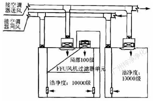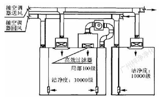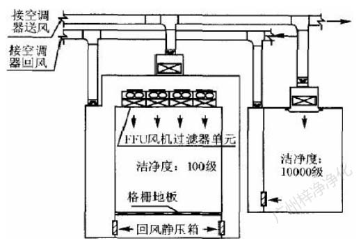 此方式的缺點(diǎn)是設(shè)置循環(huán)風(fēng)機(jī)箱及處理噪聲,需要較大的空間,而通常百級區(qū)周圍風(fēng)管都比較密集,需要精心布局。此方式百級區(qū)上部靜 壓箱相對百級區(qū)室內(nèi)為正壓,頂棚高效過濾器與吊架間的滲漏,為靜壓箱流向室內(nèi),直接影響百級區(qū)潔凈度。對施工質(zhì)量要求較高。(具 體可參考: