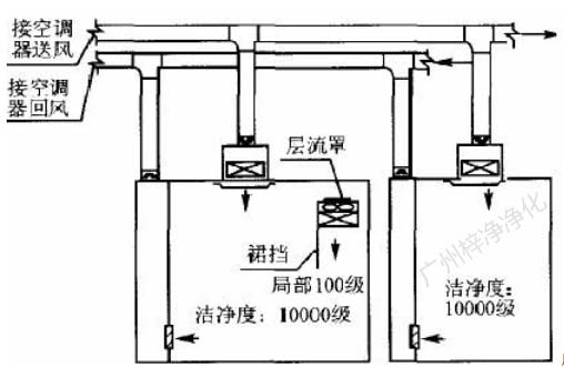 為了提高局部百級區(qū)氣流垂直層流效果,可以根據(jù)現(xiàn)場工藝設(shè)備高度及操作要求,適當(dāng)降低局部百級區(qū)吊頂,或在潔凈區(qū)吊頂下直接拼裝 百級層流罩,并在百級區(qū)邊界處裝抗靜電塑料裙擋,如圖5。