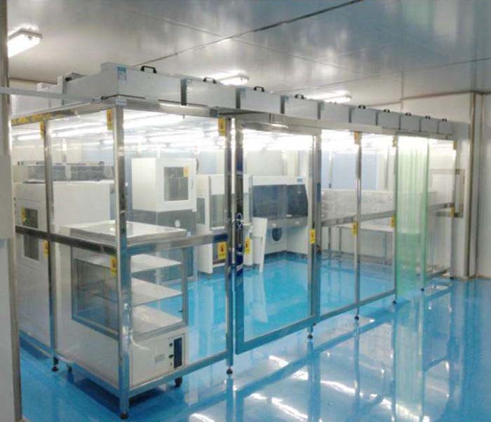 潔凈棚FFU及高效過濾器放置在由放在不銹網支架支撐棚架的托框上。頂部由盲板鋪蓋,密縫嚴密,四周用防靜電簾圍縫,四周底部利用正壓自然排風等形式,使潔凈棚區內潔凈度達到1000級。潔凈棚其具有安裝快速、施工周期短、價格低廉、移動方便等特點,如流水線作業區域,高精確度產品組裝區。